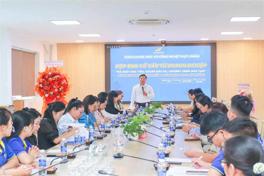 Sáng ngày 10/01/2026, tại phòng họp Cơ sở 1, ĐH Lạc Hồng, Khoa Khoa học và Công nghệ thực phẩm đã tổ chức Họp Ban Cố vấn từ Doanh nghiệp năm 2026, một hoạt động thường niên có ý nghĩa thiết thực nhằm tăng cường gắn kết giữa nhà trường và doanh nghiệp, đồng thời không ngừng nâng cao chất lượng chương trình đào tạo (CTĐT) và chuẩn đầu ra theo hướng đáp ứng sát nhu cầu thực tiễn của thị trường lao động.