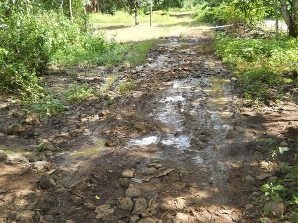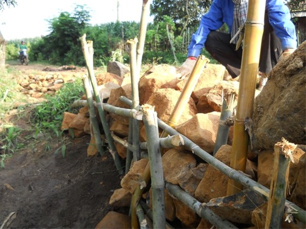Đội tổ chức lấy đá trên đồi,đóng cọc, đắp đá đường đê bị sạc lỡ vào thôn nghèo
