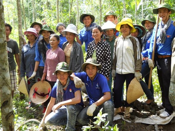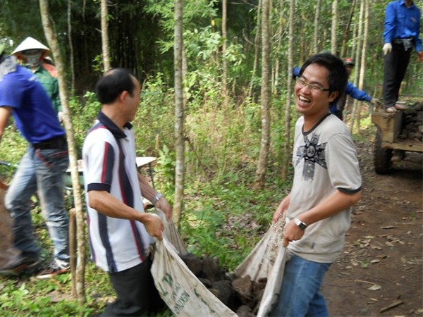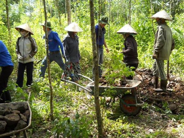 Đội Thanh niên tình nguyện cùng bà con vào rừng lấy đá về làm đường.