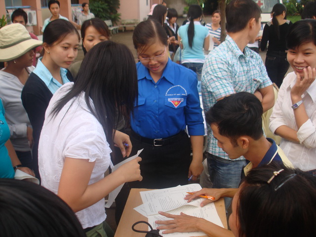 Hình 2: Các bạn sinh viên trong BCH Đoàn - Hội trường hướng dẫn sinh viên đăng ký thủ tục trước khi hiến máu.