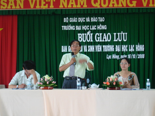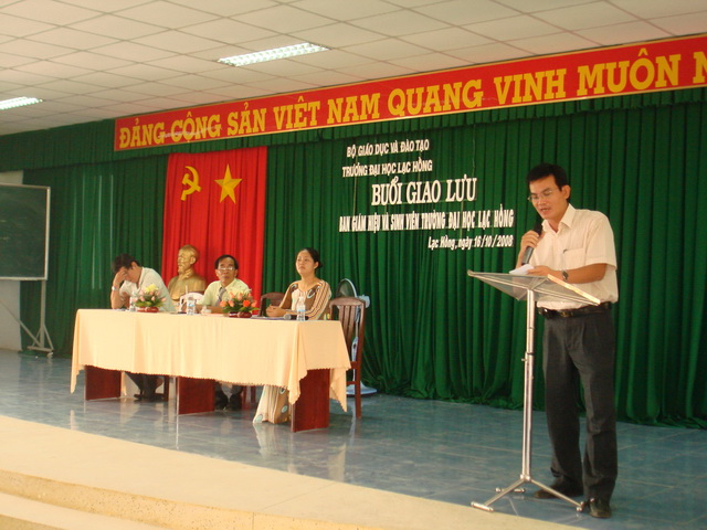 Hình 1: Thầy hiệu trưởng (giữa) đang trả lời thắc mắc của các bạn sinh viên trong buổi giao lưu