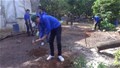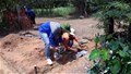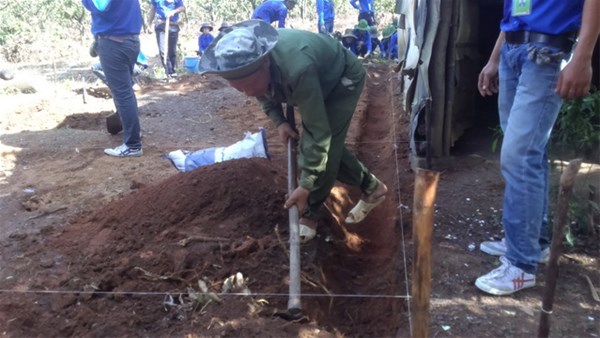 Hình 1: ông Chuyến (áo bộ đội) đang cùng sinh viên tình nguyện khai móng ngôi nhà mới