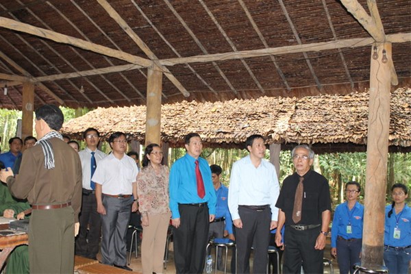 Hình 2: Đ/c Nguyễn Trùng Phương - Bí thư Đảng ủy nhà trường nói chuyện với các bạn Đoàn viên về truyền thống Chiến khu D anh hùng