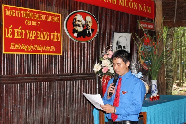Chương trình lễ kết nạp được tổ chức tại Căn cứ khu ủy miền Đông (Chiến khu D) thuộc địa bàn xã Trị An, huyện Vĩnh Cửu, tỉnh Đồng Nai vào sáng ngày 03/8/2014. Đến dự buổi lễ kết nạp về phía Tỉnh đoàn Đồng Nai có Đ/c Bùi Xuân Thống – UV. BCH TW Đoàn, Bí thư Tỉnh đoàn Đồng Nai; về phía Đảng ủy, Ban giám hiệu nhà trường có Đ/c Nguyễn Trùng Phương – Bí thư Đảng ủy nhà trường; NGND-TS Đỗ Hữu Tài – P. Bí thư Đảng ủy, Hiệu trưởng nhà trường; NGƯT-TS Nguyễn Thị Thu Lan – P. Hiệu trưởng nhà trường; Đ/c Lê Sơn Quang – Bí thư Đoàn trường; các thầy cô là trưởng, phó các phòng, khoa; các Đ/c Bí thư, phó Bí thư, Đảng viên chi bộ 3, chi bộ 4, chi bộ 7, chi bộ 9; lãnh đạo huyện ủy, UBND huyện Vĩnh Cửu; lãnh đạo Đảng ủy, UBND xã Mã Đà; cùng với 30 sinh viên tình nguyện hiện đang công tác Mùa hè xanh tại xã Mã Đà.