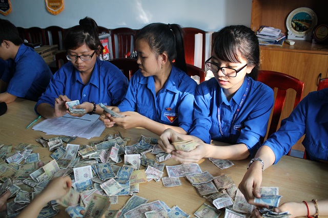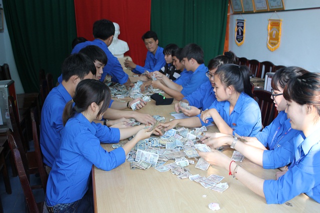 Hình 4- Đội quyên góp đang tiến hành kiểm tra và thống kê số tiền quyên góp