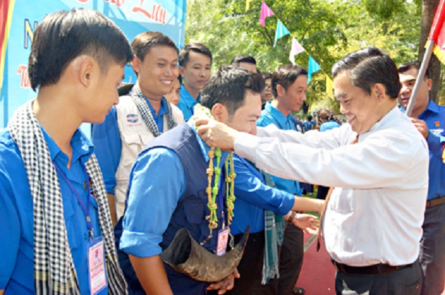 Hình 1- Đ/c Huỳnh Văn Tới - UV. BTV tỉnh ủy; Trưởng ban tuyên giáo tỉnh ủy trao tù và cho Ban huấn luyện Hội trại