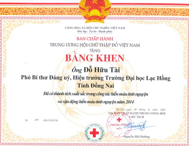 Tại hội nghị lần này, trường Đại học Lạc Hồng cũng có các cá nhân có nhiều thành tích xuất sắc trong phong trào vận động và hiến máu tình nguyện năm 2014 được Hội Chữ thập đỏ Việt Nam và UBND Tỉnh Đồng Nai tuyên dương. Cụ thể như sau: