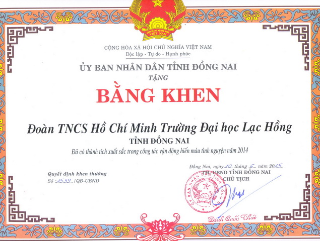 Trường ĐH Lạc Hồng tiếp tục là một trong những đơn vị dẫn đầu trong phong trào hiến máu nhân đạo khối các trường ĐH, CĐ trên địa bàn tỉnh Đồng Nai với gần 1.000 đơn vị máu được hiến trong năm 2014. Với thành tích đó, trường ĐH Lạc Hồng đã được Ban chỉ đạo quốc gia xét tặng đĩa đồng; tập thể Đoàn Thanh niên nhà trường được UBND tỉnh Đồng Nai tặng bằng khen có thành tích xuất sắc trong công tác vận động hiến máu tình nguyện năm 2014.