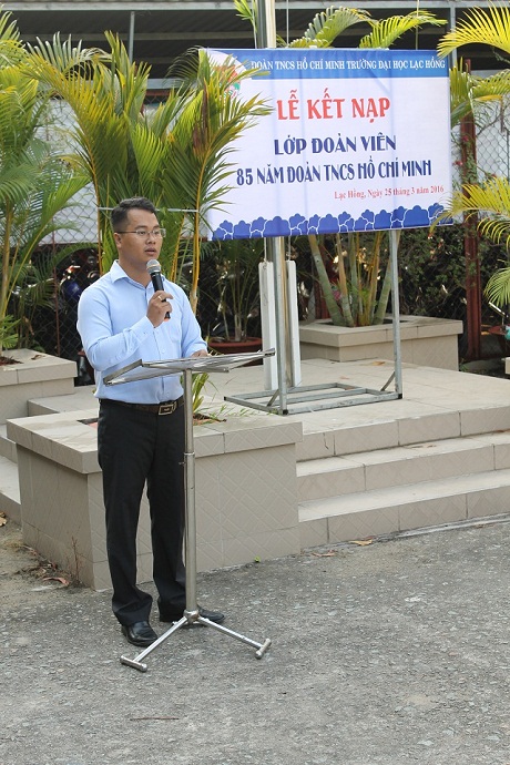 Đồng chí Lê Sơn Quang – Bí thư Đoàn trường cũng đã phát biểu chỉ đạo, định hướng phấn đấu cho các đồng chí đoàn viên mới kết nạp. Theo đồng chí, mỗi người có một quan điểm sống khác nhau, nhưng cần phải hiểu rằng, việc phát triển đoàn viên mới không chỉ là trách nhiệm của Ban chấp hành Đoàn trường mà là của tất cả Đoàn viên TNCS Hồ Chí Minh. Đoàn trường luôn phấn đấu để tạo dựng môi trường rèn luyện tốt nhất cho sinh viên, cho sinh viên trường Đại học Lạc Hồng. Đồng thời cũng gửi lời cảm ơn đến Chi đoàn cơ sở cùng các đồng chí Ban Thường vụ, các bạn sinh viên mới kết nạp Đoàn ngày hôm nay đã tạo nên thành công và sự trang trọng của một buổi lễ. Cuối lời, đồng chí Bí thư Đoàn trường kêu gọi Đoàn viên mới ra sức học tập và rèn luyện để xứng với danh hiệu Đoàn viên TNCS Hồ Chí Minh.