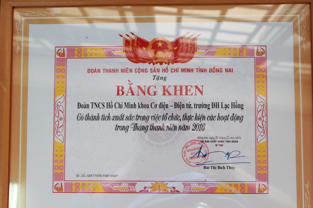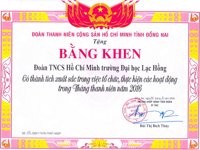 Với các thành tích đã đạt được, Đại học Lạc Hồng có 02 tập thể và 02 cá nhân được Ban Thường vụ tỉnh đoàn Đồng Nai tặng bặng khen “Hoàn thành xuất sắc nhiệm vụ Tháng Thanh niên 2016”.