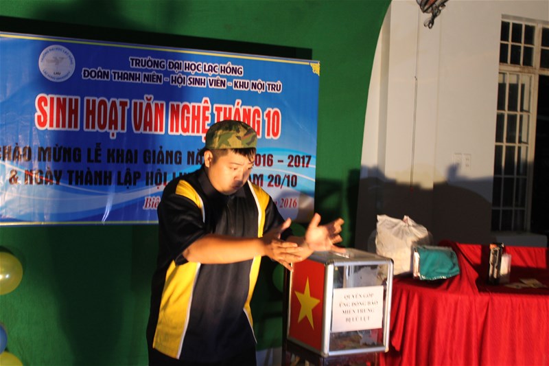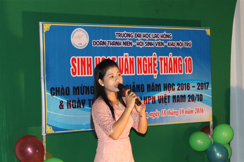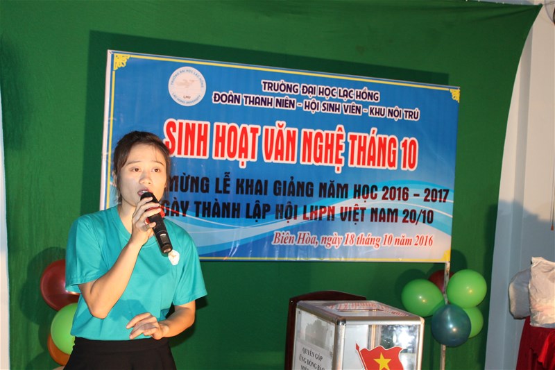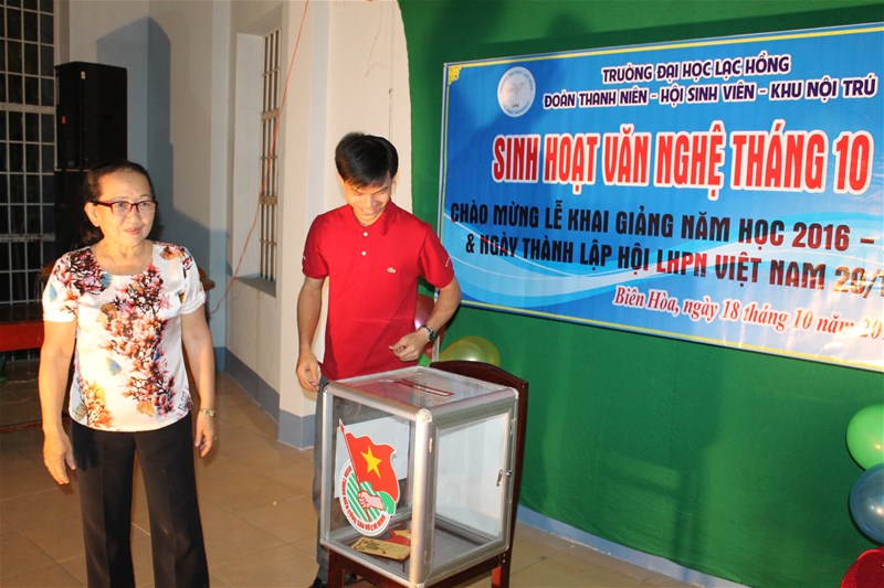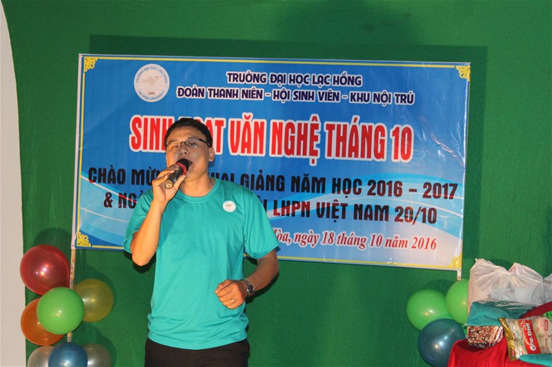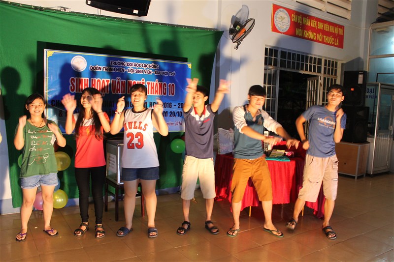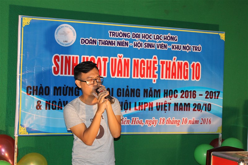 Chào mừng Lễ Khai giảng năm học 2016 – 2017 và Ngày Phụ nữ Việt Nam 20/10. Đoàn Thanh niên – Hội Sinh viên trường Đại học Lạc Hồng kết hợp với Khu Nội trú tổ chức đêm sinh hoạt văn nghệ chào mừng. Đến dự buổi sinh hoạt có NGƯT. Lê Thị Hiếu – Trưởng ban Quản Lý Khu Nội trú, Đ/c Lê Sơn Quang – Bí thư Đoàn trường, Đ/c Trần Tiến – Chủ tịch Hội Sinh viên trường.