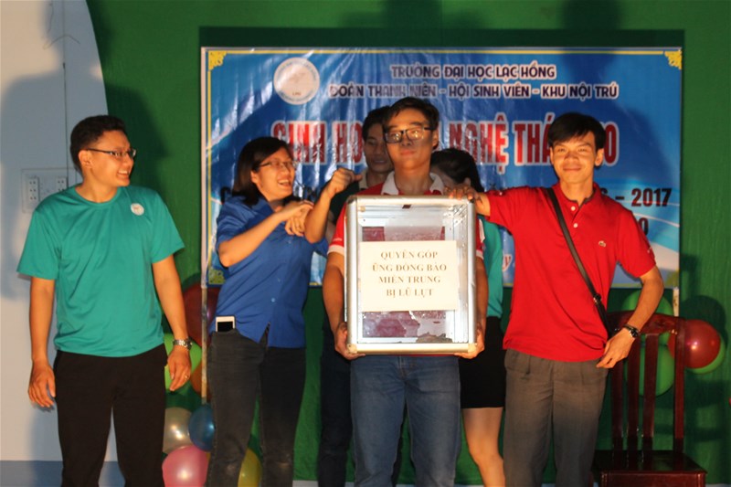 Cũng trong đêm văn nghệ, thầy cô Khu Nội trú, văn phòng Đoàn – Hội, cùng các bạn sinh viên đã thực hiện chương trình quyên góp ủng hộ đồng bào miền Trung bị lũ lụt, đang gặp khó khăn trong cuộc sống.