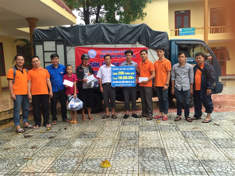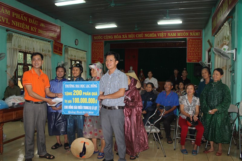 Từ ngày  31/10/2016 đến 04/11/2016 Trường Đại học Lạc Hồng trực tiếp đi tặng 200 phần quà (trị giá 100 triệu, gồm 300.000đ tiền mặt và 200.000đ quà/ 1 phần quà) tại xã Hồng Thủy, Thanh Thủy và xã Xuân Thủy, huyện Lệ Thủy, tỉnh Quảng Bình.
