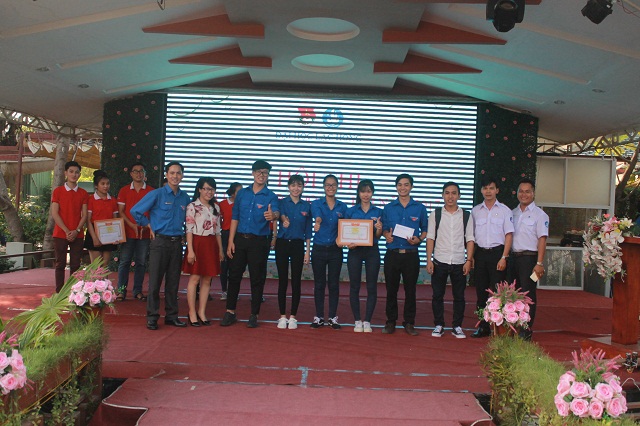 Hình 5- Đ/c Lê Sơn Quang - Bí thư Đoàn trường (Bên trái ngoài cùng) trao giải nhất cho Khoa Quản trị - Kinh tế quốc tế.