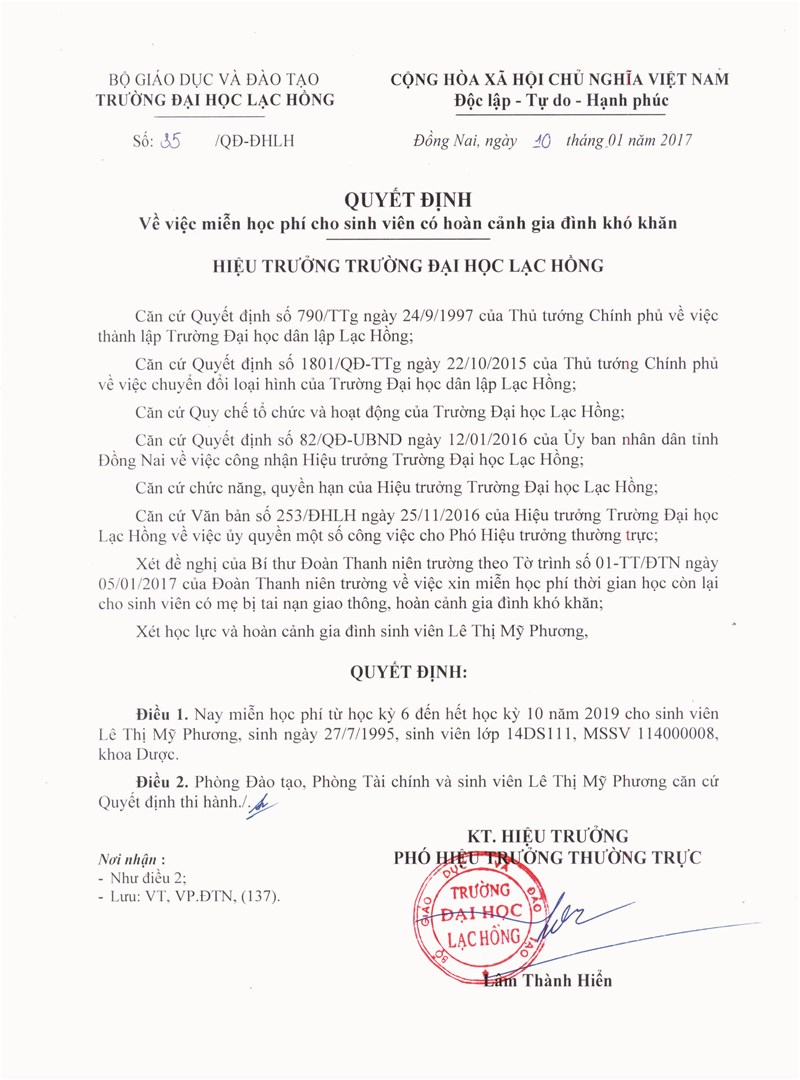 Nhân dịp tết Đinh Dậu năm 2017, Ban Giám hiệu nhà trường đã có một phần quà đặc biệt dành cho sinh viên Lê Thị Mỹ Phương, lớp 14DS111, khoa Dược. Đó là Quyết định miễn học phí cho sinh viên có hoàn cảnh khó khăn từ học kỳ 6 đến hết học kỳ 10 năm 2019.