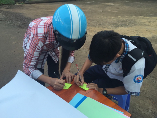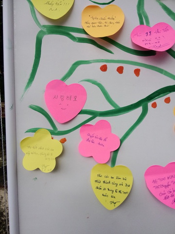 HÌnh 2: Một em học sinh đang dán các lời chúc của mình đến các bạn cùng trường lên bảng khẩu hiệu