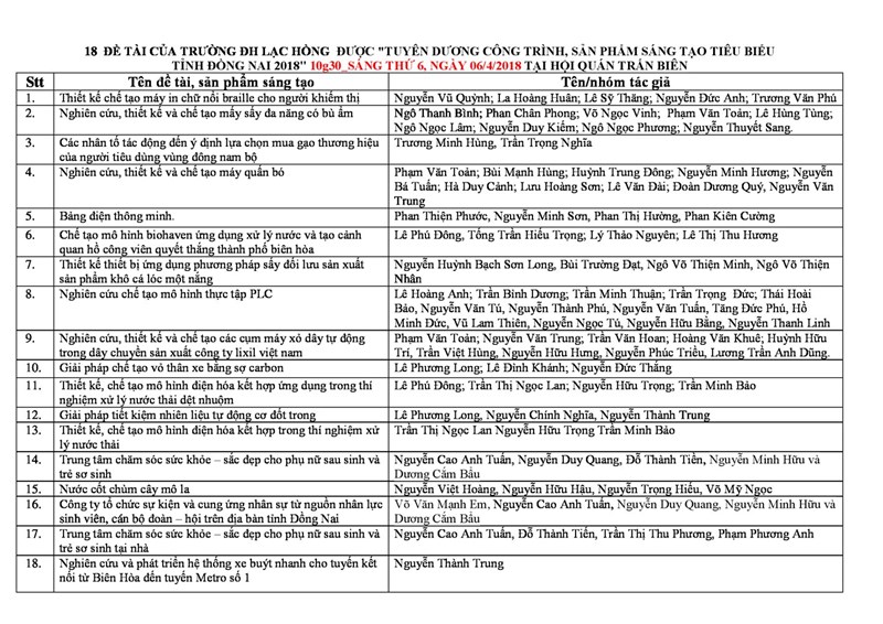 Cuối chương trình, là phần tuyên dương các công trình, sản phẩm sáng tạo tiêu biểu của năm 2018, đại diện cho trường Đại học Lạc Hồng, 18 công trình, sản phẩm đến từ các tác giả/ nhóm tác giả trong trường đã được vinh danh trong ngày hội vừa qua với những đề tài mang ý nghĩa hết sức thiết thực, trong đó có những đề tài đã được ứng dụng rộng rãi trong thực tiễn.