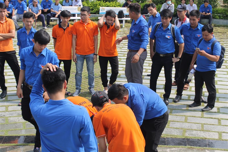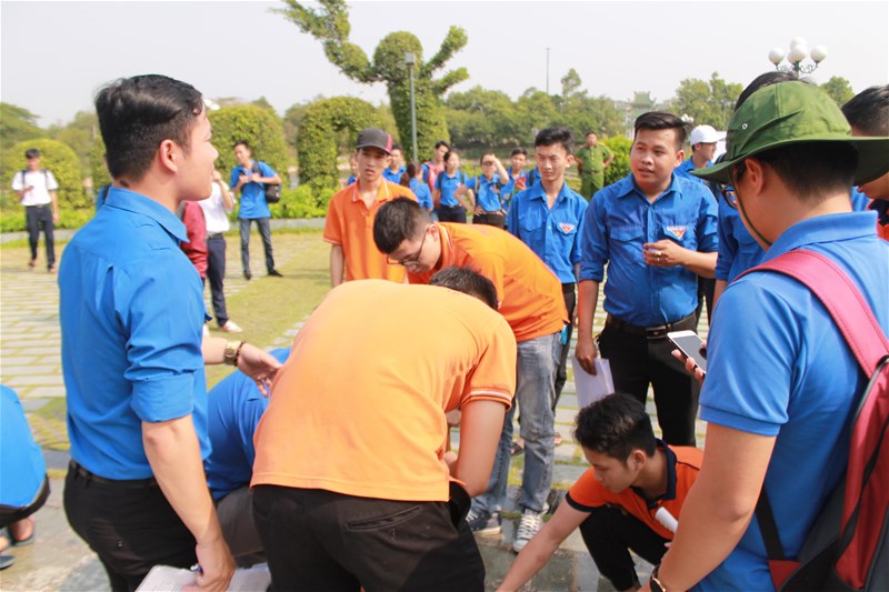 Hình 3 – Đ/c Nguyễn Đức Duy Tân – Bí thư Đoàn khoa Ngôn ngữ Anh (thứ 3 bên trái đếm qua) và Đ/c Trần Tiến Tiến – Phó Bí thư Đoàn trường, Chủ tịch Hội Sinh viên trường (thứ 6 bên trái đếm qua)