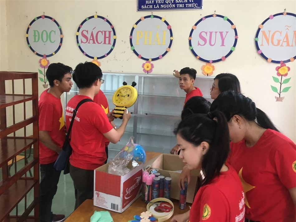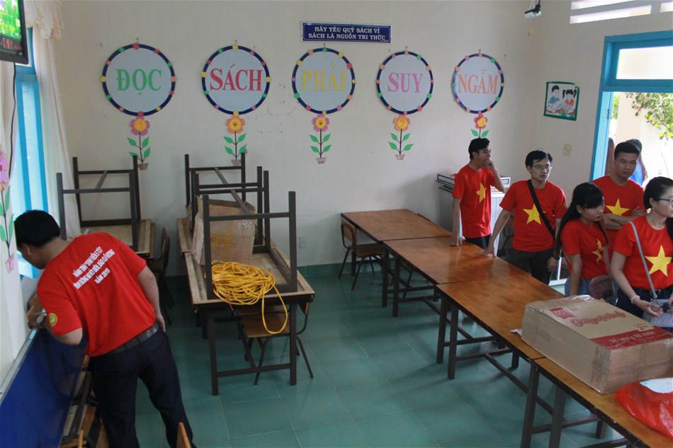 Hình 3: Các bạn sinh viên đang thực hiện công trình phòng đọc cho Trường Tiểu học Triều Dương trên địa bàn huyện