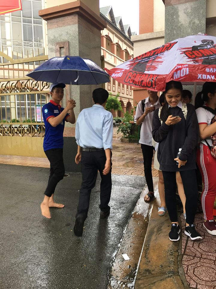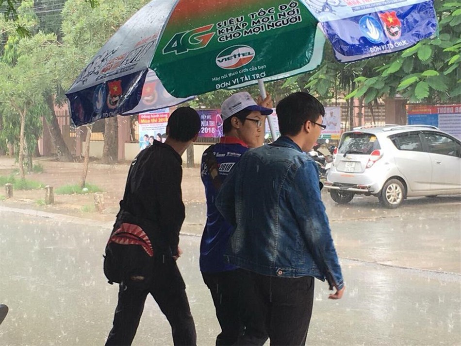 Hình 2 – Hình ảnh các chiến sĩ thanh niên tình nguyện che mưa cho các sĩ tử