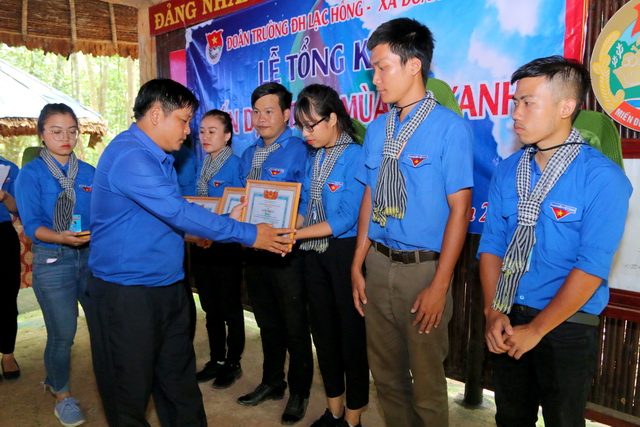 Hình 3: Đ/c Phùng Thanh Sang - P. Bí thư thường trực huyện đoàn Vĩnh Cửu tặng giấy khen của huyện đoàn cho các chiến sĩ Mùa hè xanh