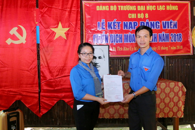 Sau khoảng thời gian theo dõi và thử thách cũng như những thành tích đã đạt được trong quá trình học tập và công tác của mình. Được sự giới thiệu của tổ chức Đoàn Thanh niên, Đảng ủy trường ĐH Lạc Hồng, chi bộ 8 (Chi bộ sinh viên) đã tổ chức công bố quyết định của Đảng ủy khối các cơ quan tỉnh để kết nạp 03 Đ/c tại khu ủy miền Đồng (Chiến khu D) thuộc địa bàn xã Mã Đà, huyện Vĩnh Cửu, tỉnh Đồng Nai vào ngày 31/7/2018.