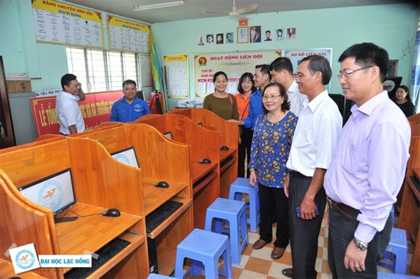Hình 4: Lãnh đạo trường Đại học Lạc Hồng cùng với đại diện các trường tiểu học tại xã Phú Lý tham quan cơ sở vật chất các phòng máy tính được lắp đặt