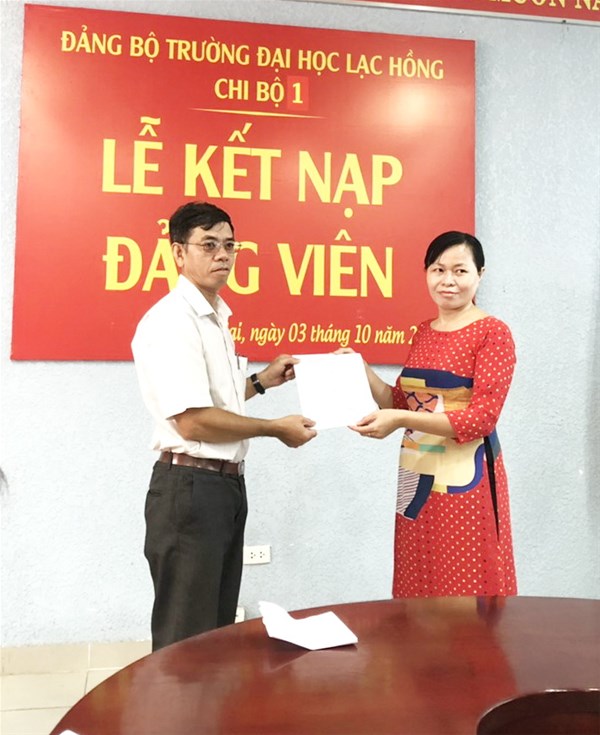 Được sự thống nhất của Ban thường vụ Đảng ủy khối, Đảng ủy trường đại học Lạc Hồng, Sáng ngày 03/10/2019 tại văn phòng họp cơ sở 1, Chi bộ 1 đã tiến hành tổ chức lễ kết nạp Đảng viên cho quần chúng xuất sắc Nguyễn Ngọc Hải vào Đảng Cộng sản Việt Nam; Đến dự buổi lễ kết nạp có Đ/c Đào Thanh Mai – Bí thư Chi bộ 1, cùng toàn thể Đảng viên trong Chi bộ.