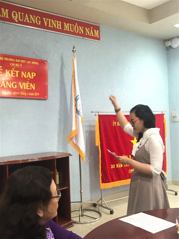 Được sự thống nhất của Ban thường vụ Đảng ủy Khối, Đảng ủy trường Đại học Lạc Hồng, vào lúc 7h30 ngày 07 tháng 11 năm 2019 tại phòng họp cơ sở 1 trường Đại học Lạc Hồng, Chi bộ 4 đã tiến hành tổ chức lễ kết nạp Đảng viên cho quần chúng xuất sắc Nguyễn Ngọc Minh Chi vào Đảng Cộng sản Việt Nam; Đến dự buổi lễ kết nạp có Đ/c Nguyễn Thị Thu Lan – Phó Bí thư Đảng ủy nhà trường – Bí thư chi bộ 4, cùng toàn thể Đảng viên trong Chi bộ.