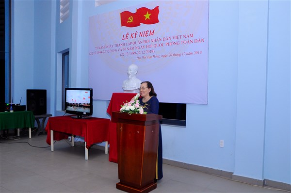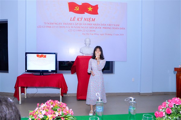 Hòa chung không khí thi đua sôi nổi của toàn đảng, toàn dân, toàn quân lập thành tích chào mừng kỷ niệm 75 năm ngày thành lập Quân đội nhân dân Việt Nam (22/12/1944 - 22/12/2019) và 30 năm Ngày hội quốc phòng toàn dân (22/12/1989 - 22/12/2019). Hội cựu chiến binh, Ban Chỉ huy quân sự và Đoàn – Hội sinh viên trường ĐH Lạc Hồng cùng phối hợp tổ chức buổi lễ kỷ niệm nhằm ôn lại truyền thống, tuyên truyền sâu rộng đến toàn thể cán bộ giáo viên, nhân viên và sinh viên nhà trường. Buổi lễ diễn ra vào lúc 18h00, ngày 20 tháng 12 năm 2019, tại sảnh Ký túc xá cơ sở 3, trường ĐH Lạc Hồng.