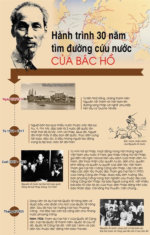 Hành trang ban đầu của Nguyễn Tất Thành khi ra nước ngoài là tri thức về văn hóa phương Đông và phương Tây, lòng yêu nước nhiệt thành, tiếp thu có chọn lọc con đường cứu nước của các nhà yêu nước lớp trước và một dự định rõ rệt, lớn lao, đó là “xem nước Pháp và các nước khác, sau khi xem xét họ làm như thế nào, tôi sẽ trở về giúp đồng bào ta”, đó là dự định đi tìm con đường cứu nước, cứu dân. Ngày 5-6-1911, trên con tàu “Đô đốc Latouche Tréville”, từ bến cảng Nhà Rồng của Sài Gòn, Nguyễn Tất Thành đã lên đường sang Pháp. Người làm bất cứ việc gì để sống và hoạt động (phụ bếp dưới tàu, làm bánh trong các khách sạn, cào tuyết, đốt lò, chụp ảnh…). Gần 10 năm, vừa lao động kiếm sống, vừa tiến hành khảo sát thực tiễn nhiều nước tư bản và các nước thuộc địa, khảo sát các cuộc cách mạng ở các nước: Pháp, Anh, Mỹ… Người đã có nhận thức quan trọng: cách mạng tư sản là những cuộc cách mạng vĩ đại, nhưng là những cuộc cách mạng chưa đến nơi. Nó đã phá tan gông xiềng phong kiến cùng những luật lệ hà khắc và những ràng buộc vô lý để giải phóng sức lao động của con người. Cách mạng tư sản xây dựng lên một chế độ mới tiến bộ hơn xã hội phong kiến. Nhưng cách mạng xong rồi dân chúng vẫn khổ, vẫn bị áp bức, bóc lột và vẫn mưu toan làm cách mạng. Từ đó, Người đi đến kết luận, chúng ta đổ xương máu để làm cách mạng thì không đi theo con đường cách mạng này; nhân dân lao động trên toàn thế giới cần đoàn kết lại để đấu tranh chống kẻ thù chung là giai cấp thống trị; cùng nhau thực hiện nguyện vọng chung là độc lập, tự do.