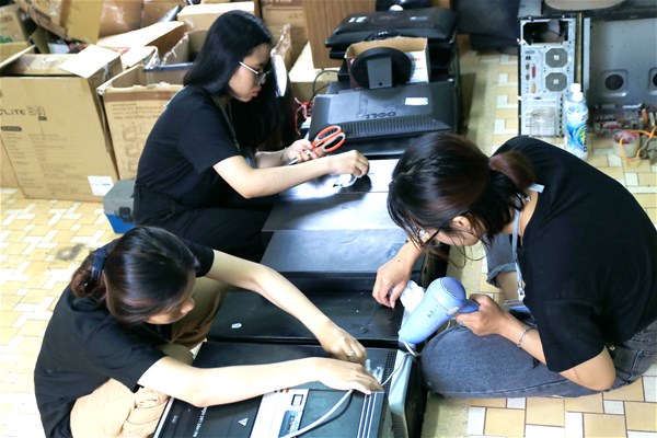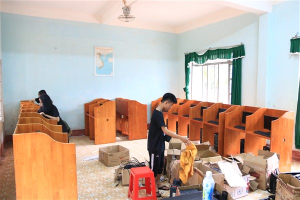Bên trong căn phòng nhỏ chỉ gần 40 mét vuông chất đầy những thùng CPU, màn hình máy vi tính cũ. Các Chiến sỹ tình nguyện mỗi người mỗi việc, người thì sắp xếp lại máy, người thì lau chùi linh kiện, bàn phím, chuột,… tạo nên một không khí sôi nổi. Tại góc nhỏ của căn phòng, một nhóm 3 Chiến sỹ đang loay hoay vệ sinh lại một lần nữa những chiếc CPU, màn hình, bàn phím trong quá trình vận chuyển bám đầy bụi, rồi lấy linh kiện gắn vào máy chạy thử lại lần cuối trước khi trao tặng.