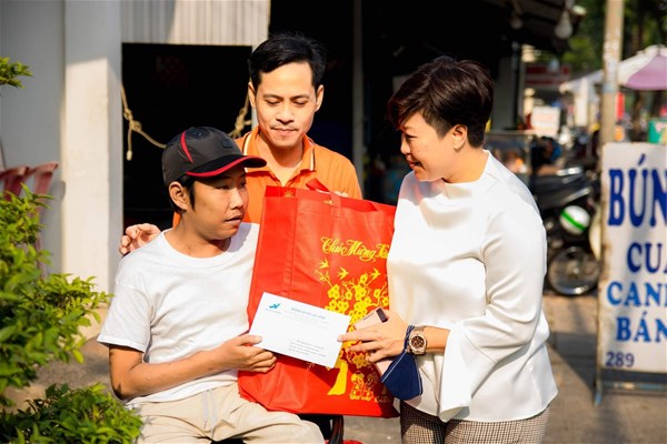 Hình 2: Cô Đỗ Thị Lan Đài - Chủ tịch Hội đồng trường Đại học Lạc Hồng trong một lần trao tặng quà trợ cấp cho các nạn nhân da cam