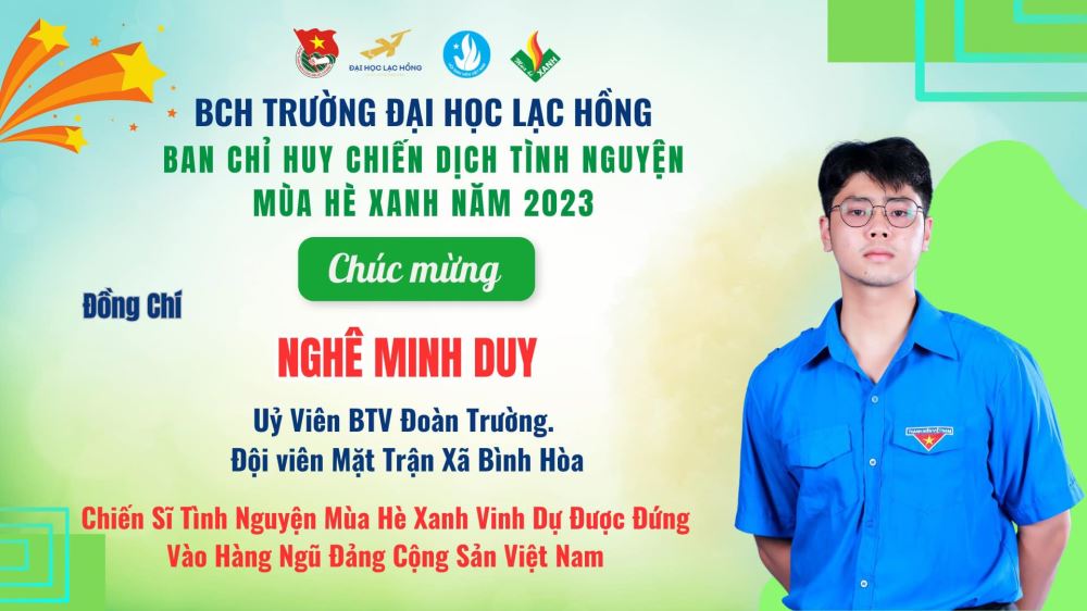 Quần chúng Nghê Minh Duy là Ủy viên BTV Đoàn trường, có thành tích học tập, rèn luyện tốt, xuất sắc hoàn thành các nội dung công tác. Bản thân tích cực tham gia các hoạt động Đoàn – Hội cấp trường, khoa, chi đoàn.