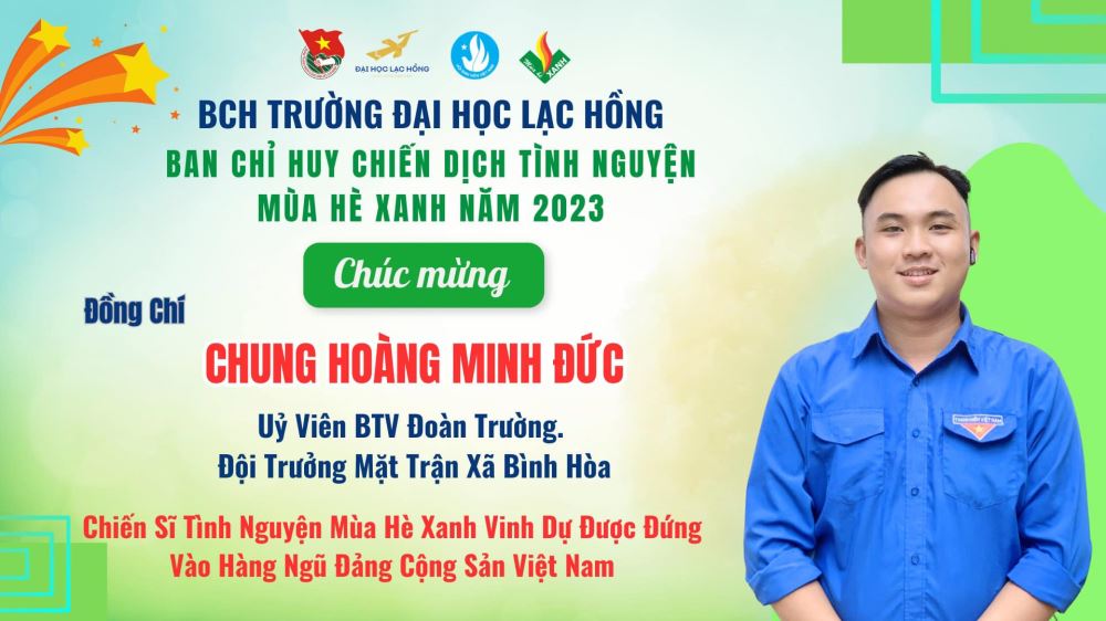 Quần chúng Chung Hoàng Minh Đức là Ủy viên BTV Đoàn trường, Nguyên Bí thư Đoàn khoa Công nghệ Thông tin, có thành tích học tập, rèn luyện tốt, xuất sắc hoàn thành các nội dung công tác. Bản thân tích cực tham gia các hoạt động Đoàn – Hội cấp trường, khoa, chi đoàn.