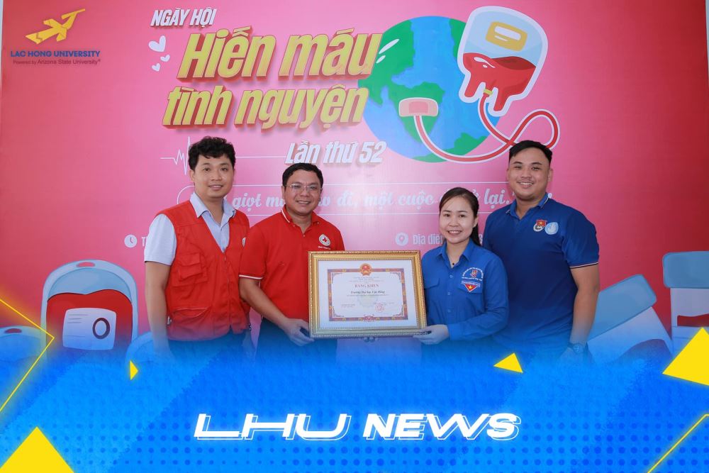 Tại ngày hội Trường Đại học Lạc Hồng nhận bằng khen của Trung ương Hội chữ thập đỏ Việt Nam đã có thành tích xuất sắc trong công tác vận động hiến máu tình nguyện năm 2024