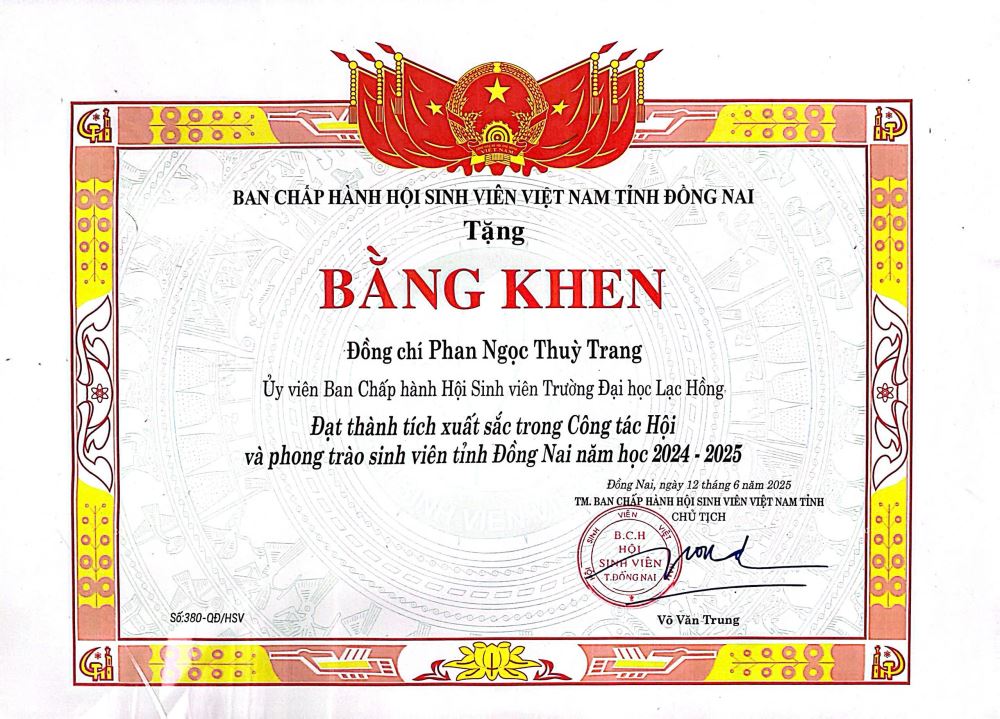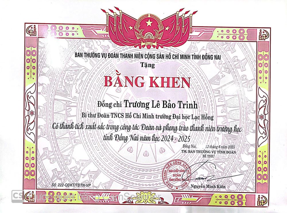 Đ/c Trương Lê Bảo Trinh – Bí thư Đoàn trường được tặng bằng khen có thành tích xuất sắc trong công tác Đoàn và phong trào Thanh niên năm học 2024 - 2025.