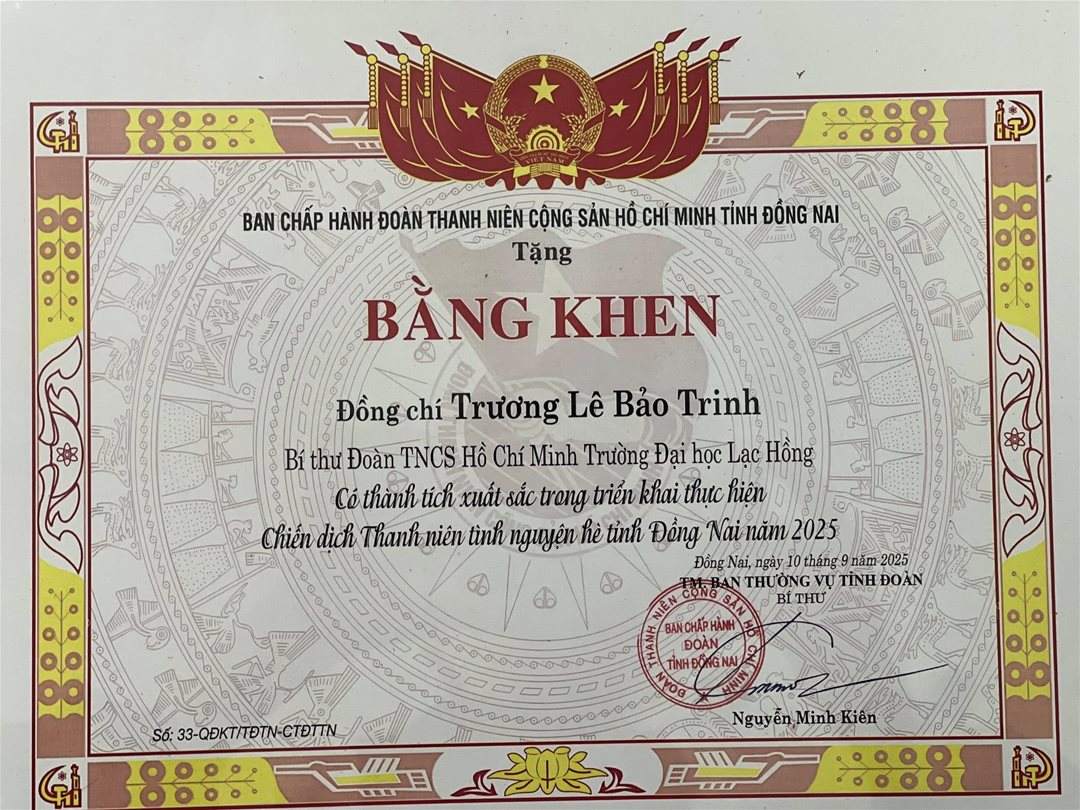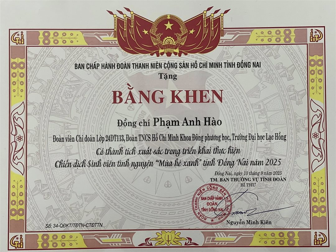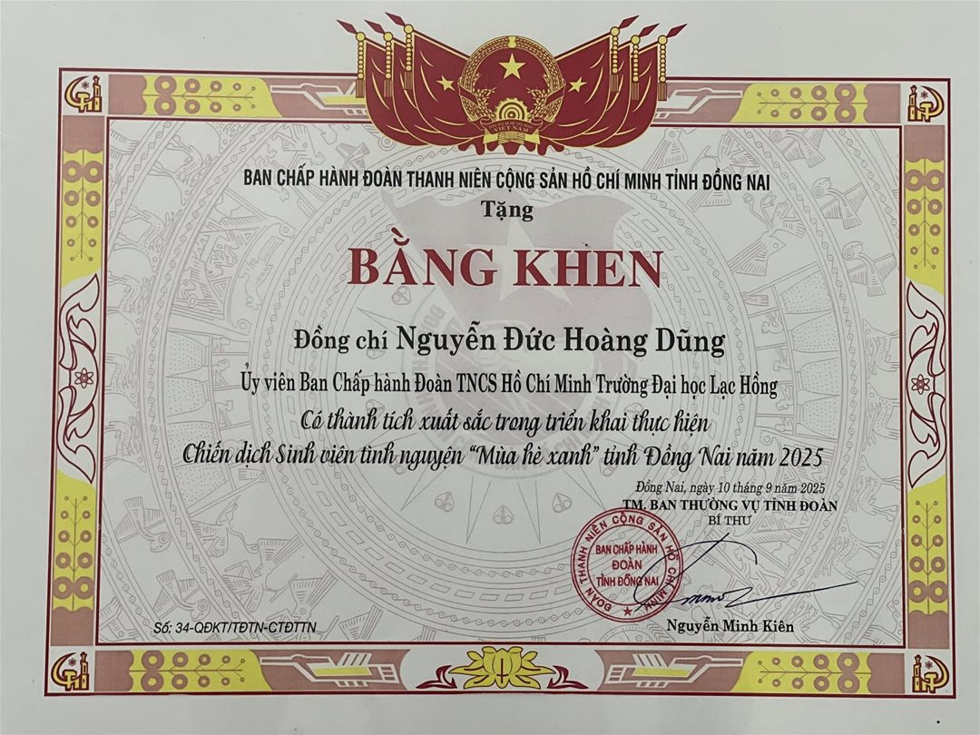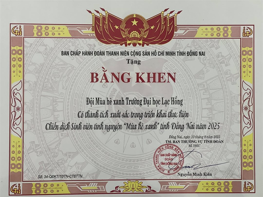 Sáng ngày 13/9/2025 tại công viên Biên Hùng, phường Trấn Biên, tỉnh Đồng Nai. Đoàn Thanh niên, Đội Mùa hè Xanh trường Đại học Lạc Hồng vinh dự nhận Bằng khen của Tỉnh đoàn đạt thành tích xuất sắc trong triển khai thực hiện Chiến dịch Thanh niên tình nguyện hè năm 2025 với các cá nhân và tập thể điền hình như sau: