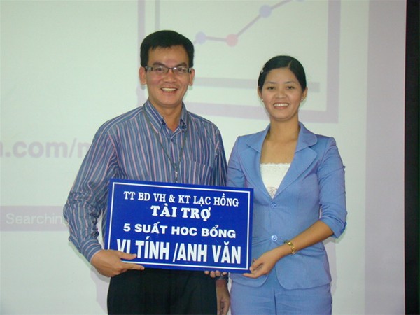 Hình 9: Th.S Nguyễn Hồ Xuân Hương - Bí thư Đoàn trường đang nhận tài trợ từTh.S Phạm Công Xuyên - GĐ TT Bồi dưỡng văn hóa kỹ thuật