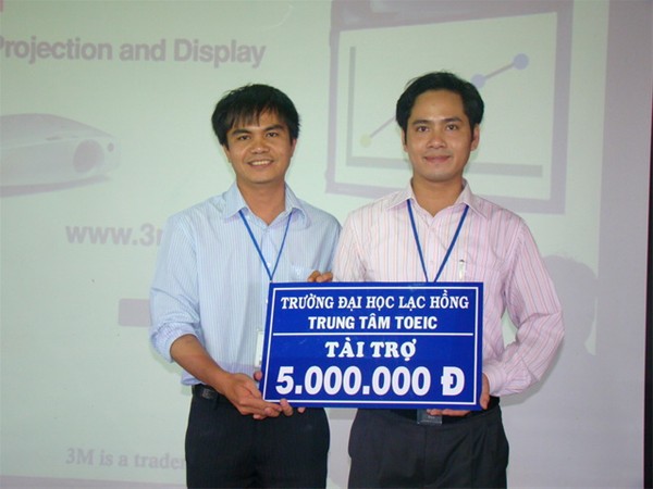 Hình 9: Đ/c Lê Sơn Quang - Chủ tịch Hội SV trường đang nhận tài trợ từ Th.S Lê Đức Thịnh - P.GĐ TT Toeic