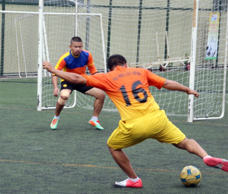 Thủ môn Đăng Khoa (Khoa KTCT - ĐH Lạc Hồng) ra sức bảo vệ khung thành