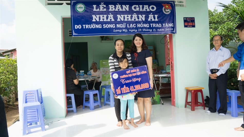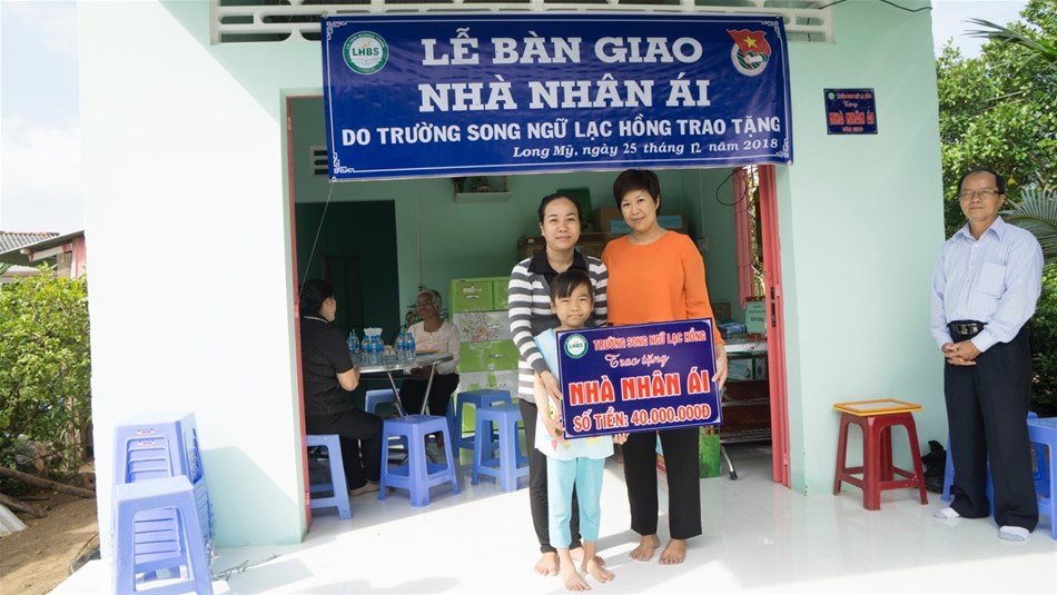 Bà Đỗ Thị Lan Đài Hiệu trưởng trường Song ngữ Lạc Hồng trao Nhà Nhân Ái