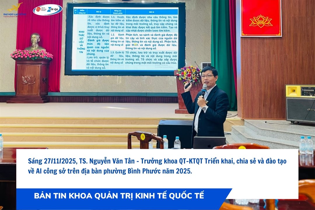 Trong phần nội dung chính, TS. Nguyễn Văn Tân – Trưởng khoa Quản trị – Kinh tế Quốc tế – đã mang đến cái nhìn toàn diện về năng lực số và ứng dụng AI trong công việc hành chính. Bài chia sẻ tập trung vào các chủ đề trọng tâm: