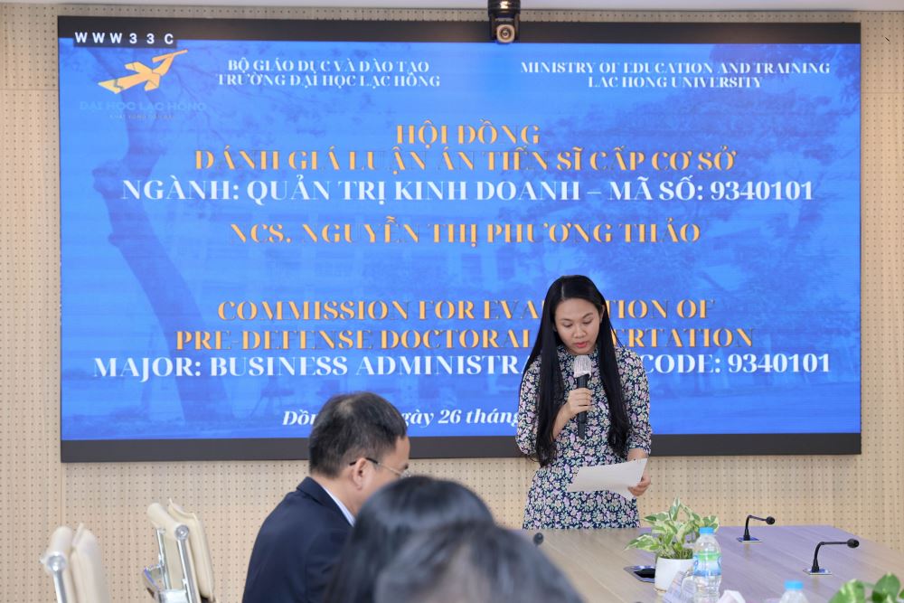 Vào chiều ngày 26/9/2024, tại phòng họp Cơ sở 1 của Trường Đại học Lạc Hồng, Khoa Sau đại học đã tổ chức thành công Hội đồng đánh giá luận án tiến sĩ cấp cơ sở ngành Quản trị Kinh doanh cho nghiên cứu sinh Nguyễn Thị Phương Thảo (Đến từ trường Đại học Đồng Nai). Buổi đánh giá là một sự kiện quan trọng, đánh dấu bước tiến mới trong hành trình nghiên cứu và học tập của nghiên cứu sinh, đồng thời thể hiện sự cam kết không ngừng của Trường Đại học Lạc Hồng trong việc hỗ trợ, đào tạo các thế hệ nghiên cứu sinh tiến sĩ đạt được những thành tựu học thuật vượt bậc.