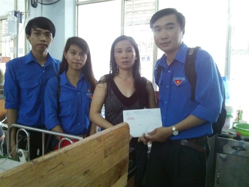 Đại diện Đoàn thanh niên Khoa trao số tiền ủng hộ cho gia đình bạn Trang sinh viên lớp 13DN112