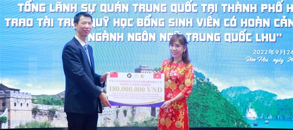 Đại diện Tổng Lãnh sự quán trao tặng 180,000,000 VND cho “Quỹ học bổng sinh viên có hoàn cảnh khó khăn ngành Ngôn ngữ Trung Quốc LHU”