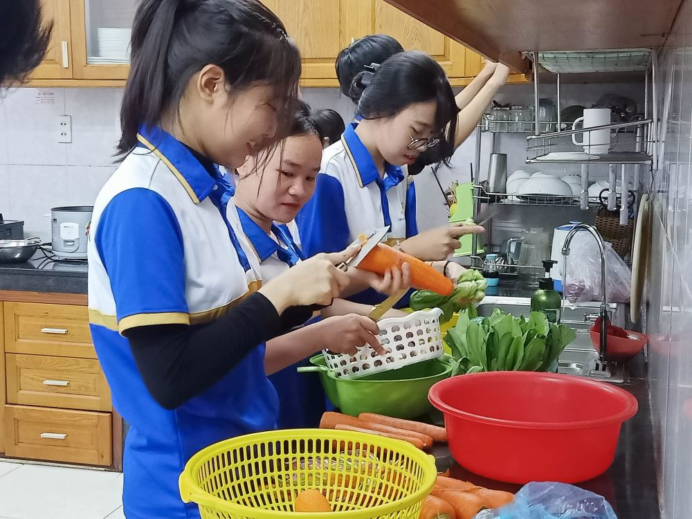 Bữa tiệc trăng rằm được sắp đặt đẹp mắt với bàn tròn và đèn lồng lung linh. Các em được học cách trải nghiệm và tham gia vào Thực hành kỹ năng team building khi đi chợ và nấu ăn. Đây là cơ hội tuyệt vời để các bạn sinh viên cùng phát huy sự sáng tạo và khám phá niềm đam mê nấu nướng. Điều này đã tạo nên một bầu không khí sôi động và đoàn kết, giúp các em thể hiện sự khao khát sức khỏe và niềm vui.