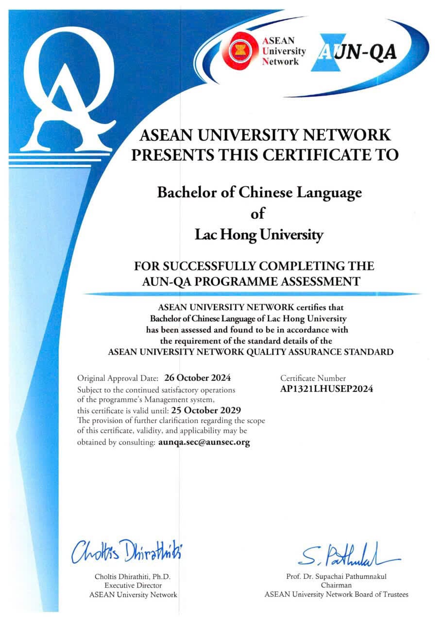 Khoa Đông phương học, Trường Đại học Lạc Hồng tự hào thông báo: Ngành Ngôn ngữ Trung Quốc chính thức đạt tiêu chuẩn kiểm định chất lượng giáo dục theo tiêu chuẩn bộ tiêu chuẩn AUN-QA (Mạng lưới Đại học ASEAN - Đảm bảo Chất lượng).