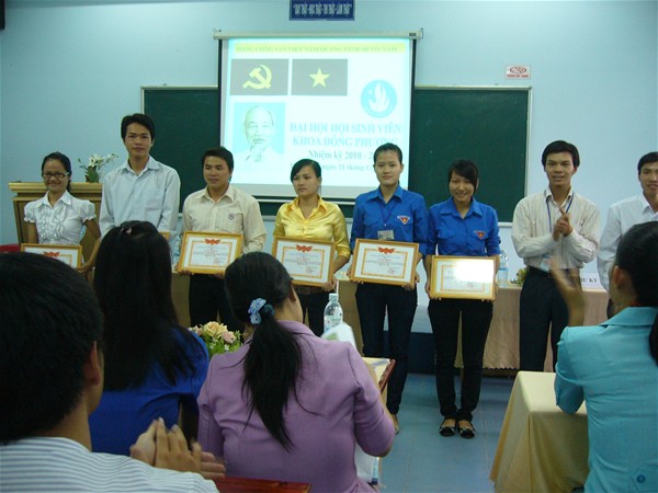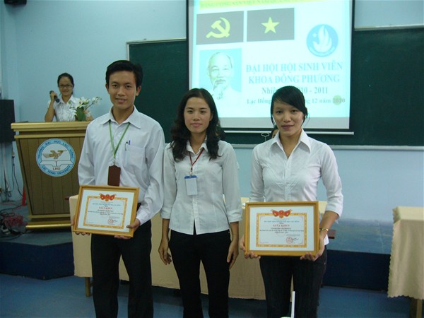 Cô Nguyễn Thị Khang trao giấy khen cho tập thể lóp 09VN111 và 09DH111 đạt thành tích xuất sắc trong các hoạt động HSV khoa Đông Phương - Nhiệm kỳ 2009 - 2010