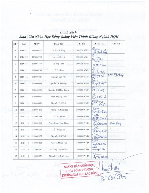 Vừa qua, ngày 30 tháng 01 năm 2021, Ngành Hàn Quốc học trao 17 suất Học bổng Khuyến học, mỗi suất trị giá 500.000VNĐ cho 17 sinh viên của Ngành Hàn Quốc học nhằm chung tay với Nhà trường khuyến khích tinh thần học tập của các em sinh viên chưa được xét trong Học bổng Nghèo – Vượt khó vừa qua của Nhà Trường.